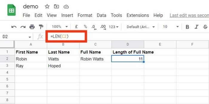 LEN() 函式用於顯示每個單元格中存在的字母總數。它通常用於嘗試區分產品編號或當我們處理具有字元限制的內容時。