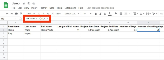NETWORKDAYS (starting_date, ending_date, [list of holidays])