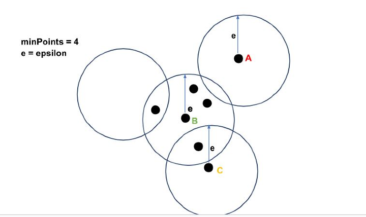 在DBSCAN演算法中,在每個資料點周圍繪製一個半徑為epsilon的圓,並將資料點分類為核心點、邊界點或噪聲點。如果資料點在epsilon半徑內有minPoints個數據點,則將其分類為核心點。如果它擁有的點少於minPoints,則稱為邊界點;如果epsilon半徑內沒有點,則將其視為噪聲點。