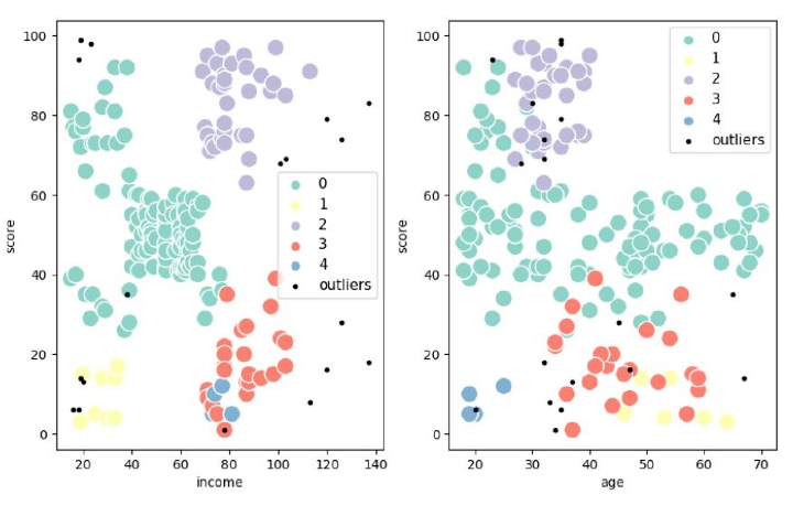 ## DBSCAN import numpy as np import pandas as pd import matplotlib.pyplot as plt from sklearn.cluster import DBSCAN import seaborn as sns data = pd.read_csv('/content/customers.csv') data.rename(columns={'CustomerID':'customer_id','Gender':'gender','Age':'age','Annual Income (k$)':'income','Spending Score (1-100)':'score'},inplace=True) features = ['age', 'income', 'score'] train_x = data[features] cls = DBSCAN(eps=12.5, min_samples=4).fit(train_x) datasetDBSCAN = train_x.copy() datasetDBSCAN.loc[:,'cluster'] = cls.labels_ datasetDBSCAN.cluster.value_counts().to_frame() outliers = datasetDBSCAN[datasetDBSCAN['cluster']==-1] fig, (ax) = plt.subplots(1,2,figsize=(10,6)) sns.scatterplot(x='income', y='score',data=datasetDBSCAN[datasetDBSCAN['cluster']!=-1],hue='cluster', ax=ax[0], palette='Set3', legend='full', s=180) sns.scatterplot(x='age', y='score', data=datasetDBSCAN[datasetDBSCAN['cluster']!=-1], hue='cluster', palette='Set3', ax=ax[1], legend='full', s=180) ax[0].scatter(outliers['income'], outliers['score'], s=9, label='outliers', c="k") ax[1].scatter(outliers['age'], outliers['score'], s=9, label='outliers', c="k") ax[0].legend() ax[1].legend() plt.setp(ax[0].get_legend().get_texts(), fontsize='11') plt.setp(ax[1].get_legend().get_texts(), fontsize='11') plt.show()