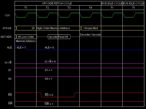 總結:因此,此指令DAD B需要1個位元組,3個機器週期(操作碼提取、匯流排空閒、匯流排空閒)和10個T狀態才能執行,如時序圖所示。此指令需要10個T狀態,包括操作碼提取。操作碼提取週期需要4個T狀態,其餘6個T狀態分為兩個機器週期,用於指令執行。在這6個T(兩個機器週期)狀態下,不執行匯流排操作。因此,它們被稱為匯流排空閒機器週期。在此期間,ALE、RD等不會被啟用。