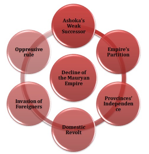 阿育王的軟弱繼承人 - 阿育王的繼承人軟弱無能,無法承擔王國的重擔。在阿育王之後,六位國王僅僅統治了 52 年。摩揭陀王朝的前三位國王確實有傑出的能力,但他們的後代與他們無法相比。末代國王 Brihadratha 被他的軍隊指揮官 Pushyamitra 推翻。