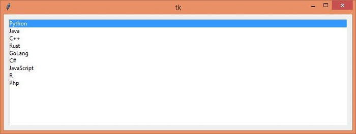 因此,假設我們在 Listbox 中有一個程式語言列表,而我們的目標是設定第一個專案選中,那麼我們可以在該方法中提供第一個列表專案的索引。必須在 mainloop() 函式結束之前呼叫該方法。