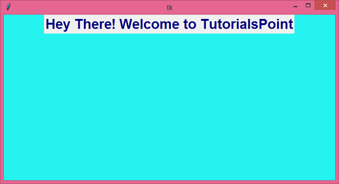 # Import the required libraries from tkinter import * #Create an instance of Tkinter Frame win = Tk() #Set the geometry win.geometry("700x350") #Set the default color of the window win.config(bg = '#24f3f0') # win.config(bg = 'SkyBlue1') Label(win, text= "Hey There! Welcome to TutorialsPoint", font= ('Helvetica 22 bold'), foreground="navy").pack() win.mainloop()