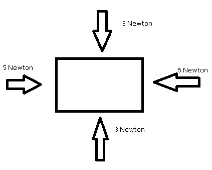 從圖中可以看出,有一個向上的 3 牛頓的力和一個向下的 3 牛頓的力,它們相互抵消,在 Y 方向上沒有合力;在 X 方向上,兩個力的大小都為 5 牛頓,且方向相反,因此在 x 方向上力也是平衡的。因此,這個矩形盒子處於平衡力的作用下。