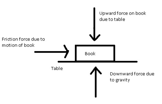 由於桌子,向上力作用在書上;由於重力,向下力作用在書上,因為在垂直方向上沒有運動,所以這些力相互平衡。由於書在右側的運動,所以在左側存在摩擦力,它阻礙運動並減慢書的速度。書隨著時間的推移會改變其運動狀態,而不是處於平衡狀態,因此書的運動被認為是在非平衡力的作用下。