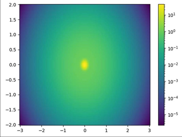 import numpy as np import matplotlib.pyplot as plt import matplotlib.colors as colors N = 100 X, Y = np.mgrid[-3:3:complex(0, N), -2:2:complex(0, N)] Z1 = np.exp(-(X)**2 - (Y)**2) Z2 = np.exp(-(X * 10)**2 - (Y * 10)**2) Z = Z1 + 50 * Z2 fig, ax = plt.subplots(1, 1) fig.colorbar(ax.pcolor(X, Y, Z, norm=colors.LogNorm(vmin=Z.min(), vmax=Z.max()), shading='auto')) plt.show()