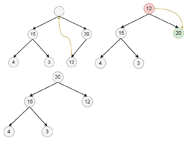 delete(heap, n) − Begin if heap is empty, then exit else item := heap[1] last := heap[n] n := n – 1 for i := 1, j := 2, j <= n, set i := j and j := j * 2, do if j < n, then if heap[j] < heap[j + 1], then j := j + 1 end if if last >= heap[j], then break heap[i] := heap[j] done end if heap[i] := last End