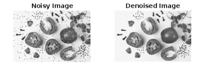 % MATLAB code to perform denoising using median filter % Read the noisy image noisy_img = imread('noisy_image.jpg'); % Replace the URL with noisy image % Convert the input image to grayscale if necessary gray_img = rgb2gray(noisy_img); % Perform denoising using the median filter denoised_img = medfilt2(gray_img, [3, 3]); % Display the noisy and denoised images figure; subplot(1, 2, 1); imshow(gray_img); title('Noisy Image'); subplot(1, 2, 2); imshow(denoised_img); title('Denoised Image');