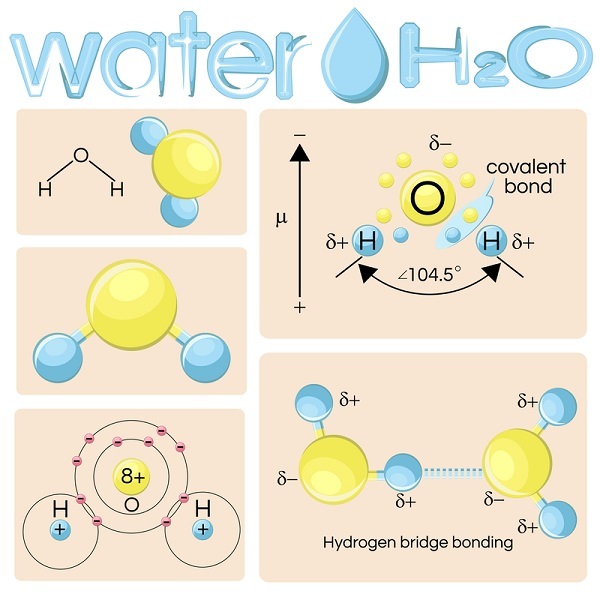 水在維持生命方面發揮的幾乎所有作用都歸因於其化學成分和一些特定的特性。它是一個簡單的分子,由2個小的帶正電的H原子和1個大的帶負電的O原子組成。當氫與氧結合時,會產生一個不平衡的分子,一側帶正電荷,另一側帶負電荷。極性似乎是電荷的差異,並控制著水與某些其他元素的反應方式。