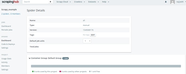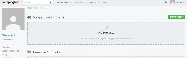 為此,您只需使用您的Gmail帳戶或Github登入ScrapingHub登入頁面即可。它將重定向到儀表板。