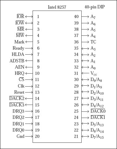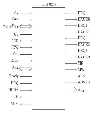 8257用於控制DMA資料傳輸,因為它包含四個I/O埠。每個I/O埠對應一個DMA通道。每個DMA通道都有一個稱為DRQ的DMA請求輸入,對應於一個DMA確認輸出。每個DMA通道都包含一個16位地址暫存器和一個16位計數暫存器。