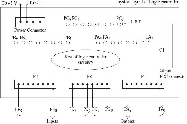 我們使用邏輯控制器,業界將其用於由軟體完成的控制流程中。通常會接受多個輸入,這些輸入執行算數和邏輯方面的完整操作序列。生成的結果用於在指定的所需限制內維護該流程。在任何時間點上,都會提供流程狀態的視覺化顯示。邏輯控制器進行介面連線,從而提供 12 條緩衝輸出,並且僅提供給為使用者指定的 12 條緩衝輸入。連線到埠 A 和 C(低於 ALS 套件上的 8255)的 12 條輸出線開始執行操作。8255 的輸出線狀態透過發光二極體(LED)進行顯示。