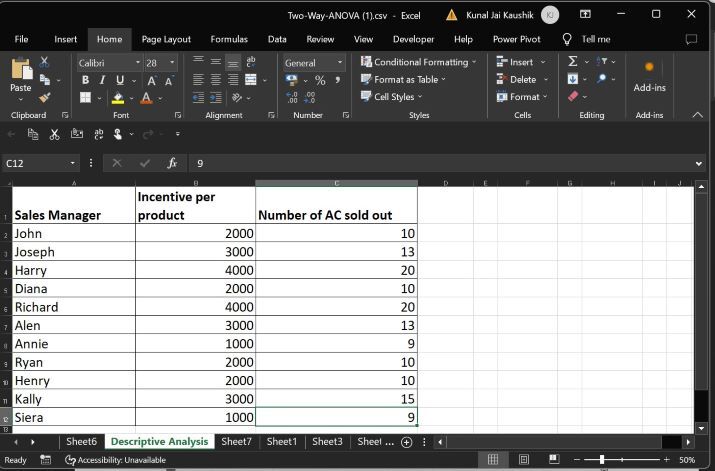 步驟1 - 在MS Excel中開啟一個新工作表,在第一列中輸入銷售經理的姓名,在第二列中寫入空調銷售後的每件產品獎勵,在第三列中寫入售出的空調數量,如下圖所示