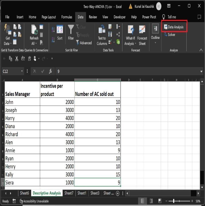 步驟2 - 點選資料選項卡,然後選擇資料分析選項,如下圖所示