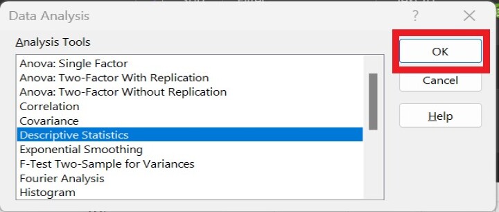 步驟3 - 將出現另一個名為資料分析的對話方塊。從下拉選單中選擇描述性統計選項,然後單擊確定按鈕。