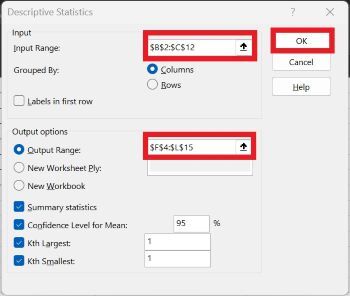 步驟4 - 將開啟另一個描述性統計對話方塊,使用者必須在各自的文字框中輸入輸入區域和輸出區域。確保使用者選擇非數值資料範圍以獲得準確的結果,否則會出錯。單擊“摘要統計”複選框、“均值的置信水平”複選框、“第K大”複選框和“第K小”複選框。之後,單擊確定按鈕。