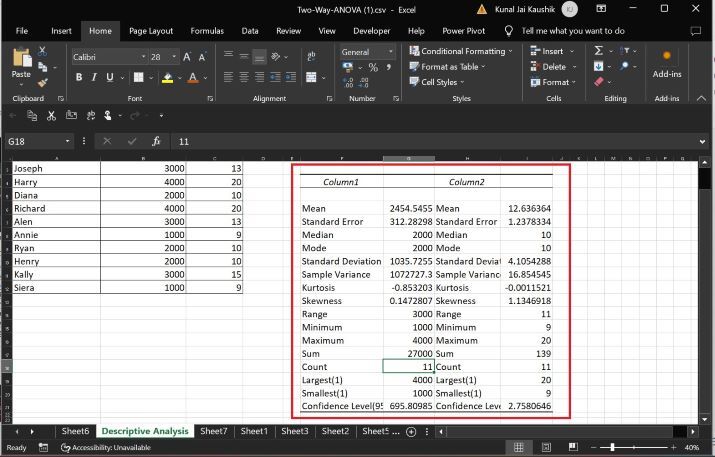 在MS Excel中,由於缺乏知識,使用者在進行統計分析時會遇到困難。Excel中提供了許多內建的統計方法,但是分別部署所有必要的統計函式非常耗時。描述性統計是“資料分析”選項卡中提供的主要選項之一,用於彙總使用者輸入的指定資料。描述性統計選項幫助我們揭示資料集的統計特徵,例如均值、眾數、最大值或最小值等。