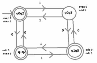 現在合併兩個狀態轉換圖以生成一個接受奇數個 0 或偶數個 1 的機器