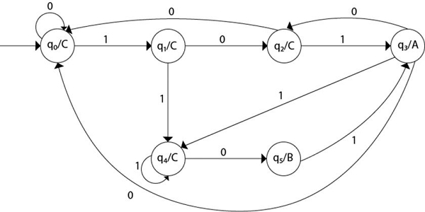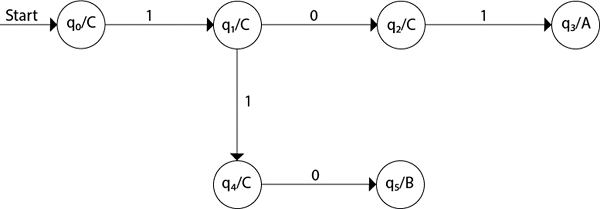 為了設計這樣的機器,我們將檢查兩個條件:"101" 和 "110"。如果檢測到 "101",則輸出 A;如果檢測到 "110",則輸出 B;對於其他字串,輸出 C。