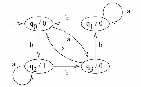 構建一個 Moore 機,對於輸入字串 "bababbb",輸出為 "01100100"。