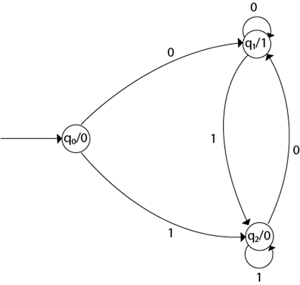 - 步驟3 - q2 在輸入 '0' 時轉移到 q1,輸入 '1' 時轉移到 q2,並生成輸出 '0'。