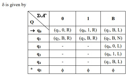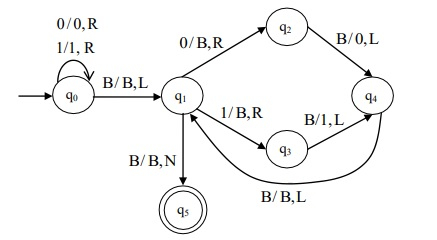 q0 → 跳過初始的“0”和“1”,並將 TM 的磁頭移動到最後一個字元。q1 → 將未處理的最右字元替換為 B。
