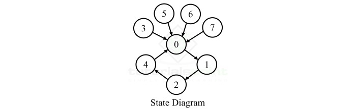 其次,繪製顯示所有可能狀態的狀態圖。狀態圖基本上是以圖形方式表示計數器經過的狀態序列。在狀態圖中,我們還可以包含計數器在下一個時鐘脈衝上從無效狀態進入特定狀態的情況。