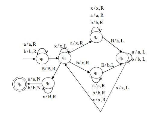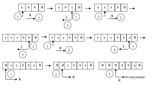 Step 1: Move to the last symbol, replace x for a or x for b and move right to convert the corresponding B to „a‟ or „b‟ accordingly. Step 2: Move left until the symbol left to x is reached. Step 3: Perform step 1 and step 2 until „B‟ is reached while traversing left. Step 4: Replace every x to B to make the cells empty since the reverse of the string is performed by the previous steps.