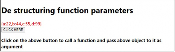 <!DOCTYPE html> <html lang="en"> <head> <meta charset="UTF-8" /> <meta name="viewport" content="width=device-width, initial-scale=1.0" /> <title>Document</title> <style> body { font-family: "Segoe UI", Tahoma, Geneva, Verdana, sans-serif; } .sample, .result { font-size: 18px; font-weight: 500; color: red; } .result { color: rebeccapurple; } </style> </head> <body> <h1>De structuring function parameters</h1> <div class="sample"></div> <div class="result"></div> <button class="Btn">CLICK HERE</button> <h3>Click on the above button to call a function and pass above object to it as argument</h3> <script> let sampleEle = document.querySelector(".sample"); let resultEle = document.querySelector(".result"); sampleEle.innerHTML = "{a:22,b:44,c:55,d:99}"; function add({ a = 0, b = 0, c = 0, d = 0 }) { return a + b + c + d; } document.querySelector(".Btn").addEventListener("click", () => { resultEle.innerHTML += "Sum = " + add({ a: 22, b: 44, c: 55, d: 99 }); }); </script> </body> </html>