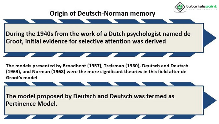 Deutsch-Norman 記憶模型被稱為後期選擇理論。在這個理論中,不會根據特徵進行過濾。相反,進入的刺激會與長期記憶的內涵內容進行交叉檢查。刺激的選擇取決於對其重要性的評估。根據這個記憶模型,不需要注意力來直觀地處理和識別專案。然而,建立更持久的影像資訊至關重要。