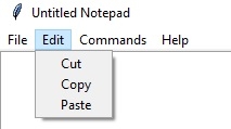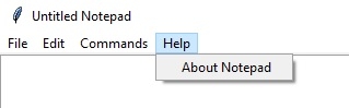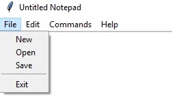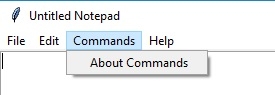 # To open new file self.__thisFileMenu.add_command(label="New", command=self.__newFile) # To open a already existing file self.__thisFileMenu.add_command(label="Open", command=self.__openFile) # To save current file self.__thisFileMenu.add_command(label="Save", command=self.__saveFile) # To create a line in the dialog self.__thisFileMenu.add_separator() self.__thisFileMenu.add_command(label="Exit", command=self.__quitApplication) self.__thisMenuBar.add_cascade(label="File", menu=self.__thisFileMenu) # To give a feature of cut self.__thisEditMenu.add_command(label="Cut", command=self.__cut) # to give a feature of copy self.__thisEditMenu.add_command(label="Copy", command=self.__copy) # To give a feature of paste self.__thisEditMenu.add_command(label="Paste", command=self.__paste) # To give a feature of editing self.__thisMenuBar.add_cascade(label="Edit", menu=self.__thisEditMenu) # To create a feature of description of the notepad self.__thisHelpMenu.add_command(label="About Notepad", command=self.__showAbout) self.__thisCommandMenu.add_command(label = "About Commands", command=self.__showCommand) self.__thisMenuBar.add_cascade(label="Commands", menu=self.__thisCommandMenu) self.__thisMenuBar.add_cascade(label="Help", menu=self.__thisHelpMenu)