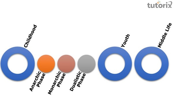 - **無政府階段**——其特點是意識混亂和不規律,不同時期之間幾乎或根本沒有聯絡。某些經驗有時以原始意象的形式進入意識,這些意象無法得到充分的表達。這可以被稱為“意識島”。