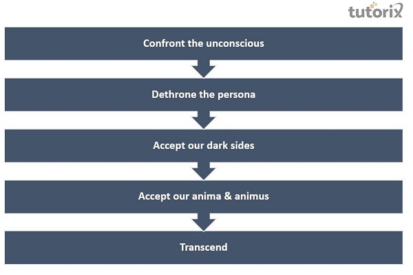 - **面對潛意識**——第一步是放棄指導我們人生前半生的行為和價值觀,面對我們的潛意識,並接受它告訴我們的東西。這意味著傾聽我們的夢想,追隨我們的幻想,併發揮創造性想象力。理性思維不應該是指導;自發性應該是(潛意識的流動)。然而,這並不意味著完全受潛意識支配,讓它支配我們,而是要在兩者之間取得平衡。