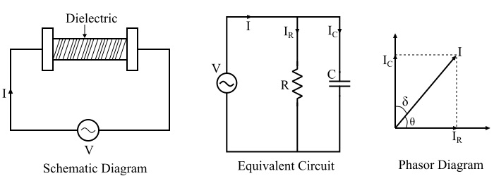 參考下圖。有兩個電極,由介電介質(即待加熱的材料)隔開,並在電極之間施加高頻電位差。這種佈置形成一個電容器。等效電路的相量圖也顯示在上圖中。介電加熱裝置中形成的電容器可能不是純電容器,因此電路中也並聯了一個電阻器“R”。但是,電阻“R”的值非常高,因此流過它的電流非常小。因此,電容電流Ic可以認為等於總電流I。