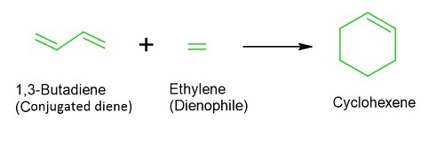 它常用於合成橡膠、塑膠,甚至包括皮質醇和維生素 D 在內的人工類固醇。該反應實際上是一個一步過程,從 2 個分子開始,並以一個六元環結束。在整個反應過程中,3 個雙鍵被破壞,產生了 2 個新的單鍵,以及 1 個新的雙鍵。根據反應物,所得的環狀六元環似乎在其周圍連線有其他環,以及主要位於外側的官能團和取代基。