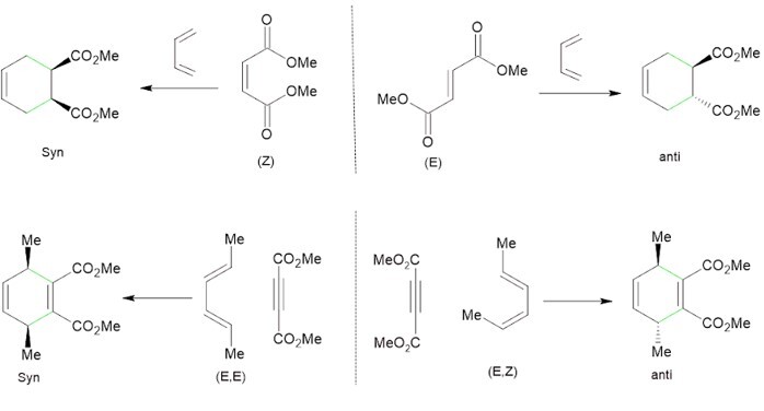 該過程是立體專一的,因為親雙烯體的立體化學在環己烯產物中得以保留:反式親雙烯體生成反式產物,順式親雙烯體生成順式產物。
