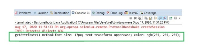 這裡,**style** 是一個屬性,其值可以透過使用 getAttribute() 方法獲得。如果我們對該元素應用 getText() 方法,我們將獲得文字。