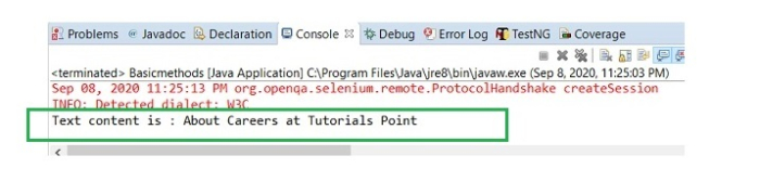 import org.openqa.selenium.By; import org.openqa.selenium.WebDriver; import org.openqa.selenium.WebElement; import org.openqa.selenium.chrome.ChromeDriver; import java.util.concurrent.TimeUnit; public class GetElementText{ public static void main(String[] args) { System.setProperty("webdriver.chrome.driver","C:\Users \ghs6kor\Desktop\Java\chromedriver.exe"); WebDriver driver = new ChromeDriver(); driver.manage().timeouts().implicitlyWait(5,TimeUnit.SECONDS); driver.get("https://tutorialspoint.tw/about/about_careers.htm"); // identify element WebElement p=driver.findElement(By.xpath("//h1")); //getText() to obtain text String s= p.getText(); System.out.println("Text content is : " + s); driver.close(); } }