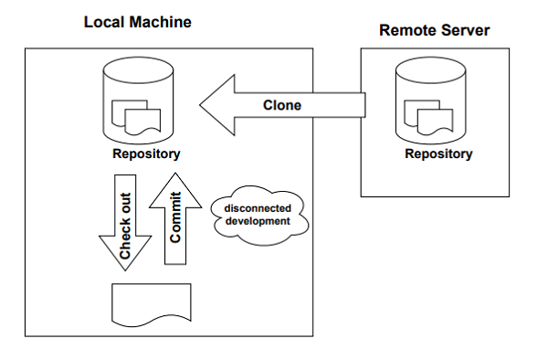 與分層結構的集中式版本控制系統不同,分散式版本控制系統採用更平等的方法。就像在集中式版本控制系統中一樣,您檢出程式碼庫的副本,進行更改,然後檢入。兩種型別之間的主要區別在於,集中式版本控制系統將更改歷史記錄儲存在中央伺服器上。每個人都請求最新版本的工作,並將最新的更改推送到中央伺服器。
