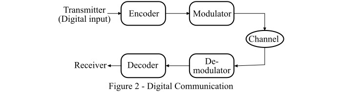 在這裡,資訊首先被編碼成數字訊號(二進位制形式)並進行調製。然後,調製器以數字形式(資料包形式)在通訊通道上廣播資訊。在接收端,解調器恢復資訊並將其提供給解碼器,以便獲得輸出訊息。