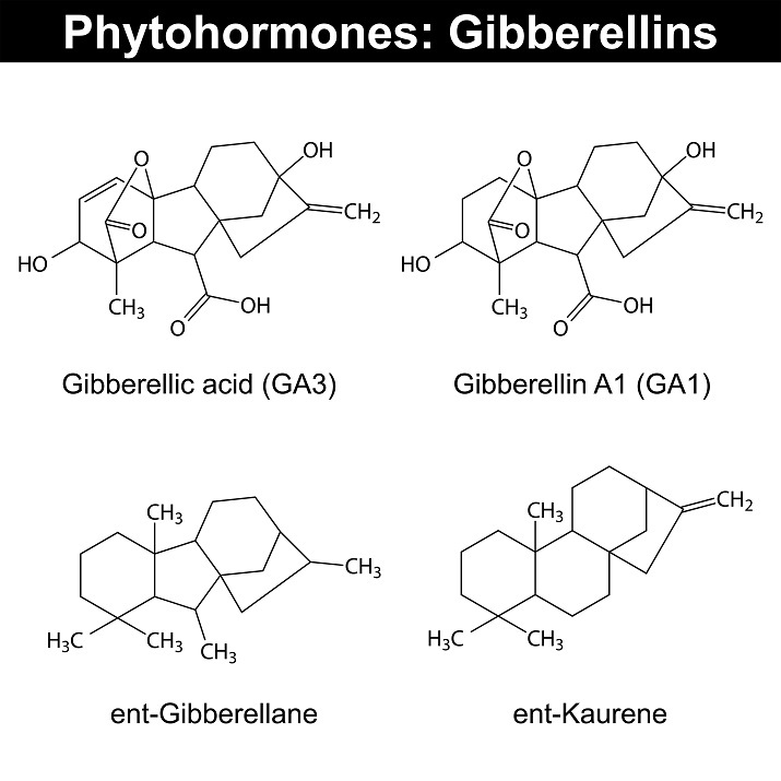 此外,還有一些合成生長素,如 NAA(萘乙酸)和 2, 4-D(2, 4-二氯苯氧乙酸)。赤黴素或 GA 有助於增加節間伸長、葉片生長和頂端優勢。