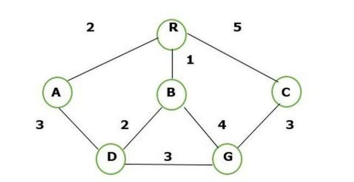R -> A -> D -> G (3+3+2 = 8),R -> B -> D -> G (3+2+1 = 6) 和 R -> B -> G (9+1 = 10),R -> C -> G (5+3 = 8)