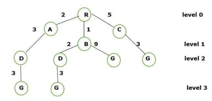 層級 2 - R -> A -> D,R -> B -> D 和 R -> B -> G,R -> C -> G