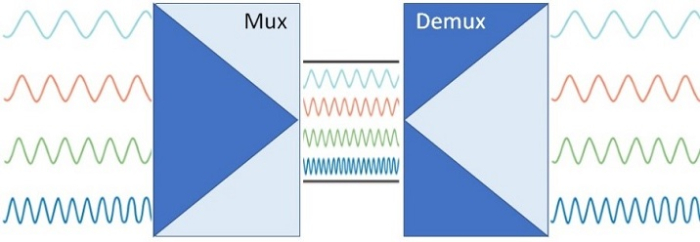 具有不同頻率的訊號由多路複用裝置接收,作為單個邏輯訊號透過介質傳輸,然後再次分成多個訊號。