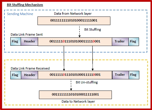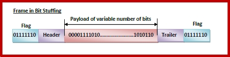 在這裡,定界標誌序列通常包含六個或更多連續的1。大多數協議使用8位模式01111110作為標誌。為了在序列相同的情況下區分訊息和標誌,在訊息中填充單個位元。每當訊息中出現0位元後跟五個連續的1位元時,就在五個1位元的末尾填充一個額外的0位元。當接收方收到訊息時,它會移除五個1位元之後填充的0位元。然後將未填充的訊息傳送到上層。