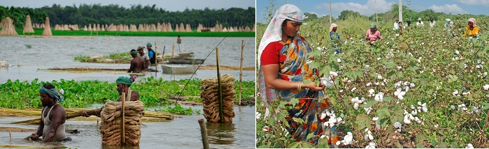 棉花的用途很多。為了製造耐用的服裝、牛仔褲、包袋、家用紡織品、毛巾和其他物品,它首先被紡成輕質紗線,然後被織成或編織成華麗、透氣的織物。相比之下,黃麻是一種有光澤的植物,用於製造更堅固、更粗糙的線。這些紗線用於生產地毯襯墊、包袋、床墊和其他物品。