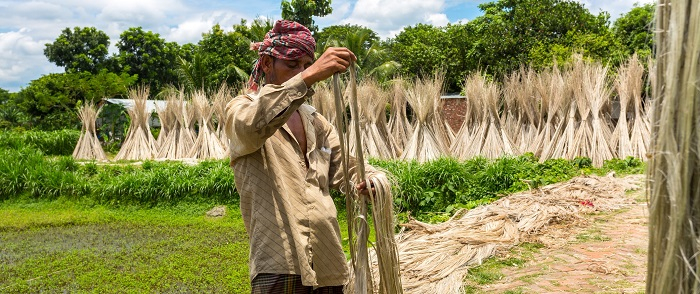 它是天然纖維中最堅固的一種。在所有纖維中,它也是最便宜的。它是一種韌皮纖維,就像大麻和亞麻一樣。孟加拉國和印度是熱帶國家,黃麻植物生長良好。黃麻纖維取自黃麻植物的樹皮。它是在類似於有機農業的條件下以傳統方式種植的。人們可以食用幼小的黃麻植物作為蔬菜。它用於製造重型繩索、窗簾、紙張、鞋子、地毯襯墊、麻袋、躺椅和午餐袋等。此外,它還可以與棉花一起用於製造襯衫、褲子、外套和其他型別的服裝等高階產品。黃麻主要種植在沖積土中,這種土壤存在於恆河和雅魯藏布江三角洲地區。黃麻主要種植在印度的阿薩姆邦、西孟加拉邦和比哈爾邦。黃麻有時被稱為“金色纖維”。它具有長而絲滑的纖維,柔軟、有光澤且光滑。