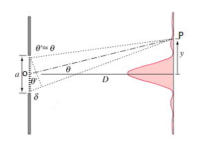 從圖中我們可以觀察到,有兩條光線以 $\mathrm{\frac{a}{2} sin \theta}$ 的路程差傳播到點 P。