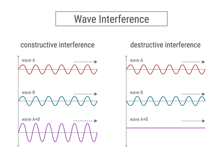 兩種不同振幅的波疊加在一起,形成一個具有新振幅的合成波的現象。振幅的大小取決於干涉的型別。干涉有兩種型別。